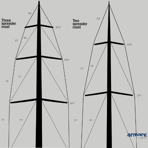 Any stay joining the mast is called a Diagonal, and these are again numbered, relative to the mast panel e.g. D1, D2 etc. Across the top spreader there is normally a single stay with no junction i.e. it just bends around the spreader end. This single rod/wire/cable is often referred to as the "Top-span". In the lower half, it is acting as a vertical and then up to the mast it is a diagonal. On a 2-spreader rig this top-span cable is called the V2/D3 and on a 3-spreader rig V3/D4.