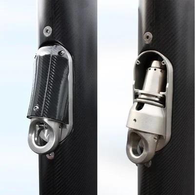 With tripless, you hoist the lock mechanism into the lock, you reach a mark on your halyard and it automatically locks into position. To release, you hoist the halyard a few centimetres past the locking position until the mechanism releases, at which point you can lower the sail.
