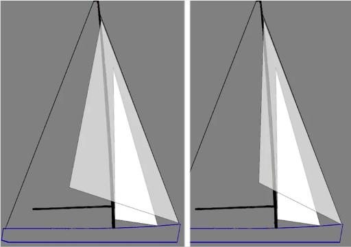 In heavy-running conditions, the high clewed sail can be swung out with a spinnaker or whisker pole.