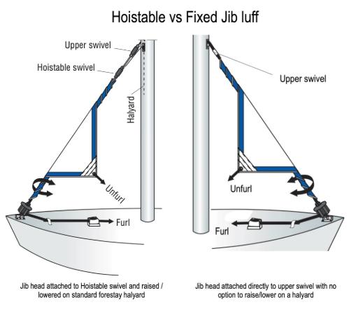 An additional 438 kit has the same drum and top swivel as the 435 but includes what Harken calls a Hoistable Swivel (labelled "H-Swiv" in table above). At Upffront we would call this a Halyard Swivel as its purpose is to allow the use of a standard jib halyard on a structural furling forestay, so that the jib can be raised/lowered without disconnecting the forestay. For a detailed description of how halyard swivels work, please refer to a blog dedicated to the halyard swivel.