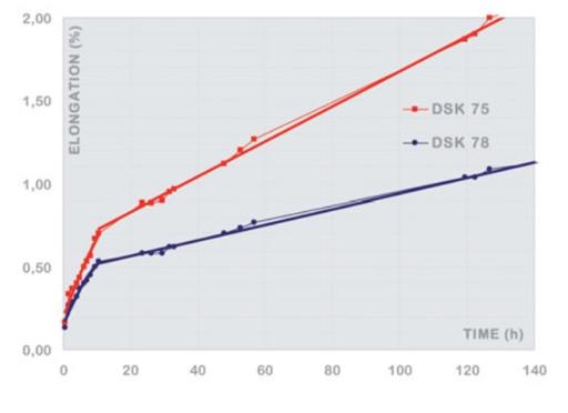 Source Gottifredi Maffioli: Comparison of creep properties between Dyneema Rope SK75 and SK78 at 25˚C and an average static load equal to 25% of break strength.