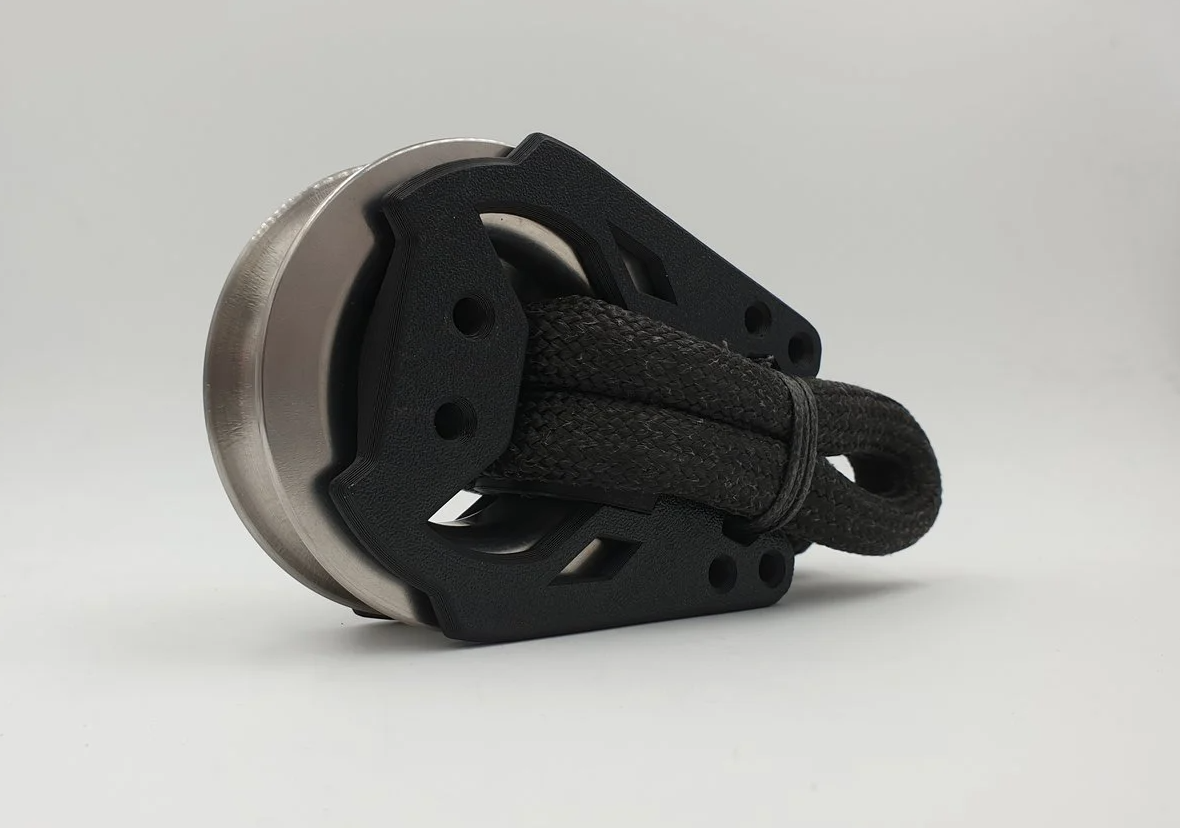 'The original aim was to create an all-purpose block – a standard product that was light and could withstand high loads, whilst avoiding complex deck setups,’ Nicolas says. The premise was simple: customers could attach any lash thimble to the Morf Block parts (the cheeks, plain bearing and Dyneema® attachment) and make a block.