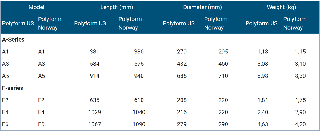 To help you make an informed choice, here is a technical comparison of the most popular F-series fenders from both Polyform US and Polyform Norway: