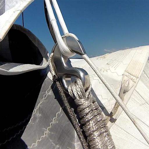 A reef hook is installed close to the boom’s axis with a lashing. A small diameter control line guides the hook to the mainsail reef point, where a sheathed, high load Dyneema strop is sewn into the sail. This control line is used to draw the sail loop to the hook where it automatically locks into place.