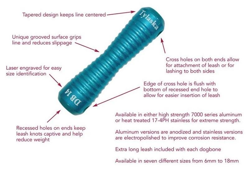 With its unique patent, the Tylaska stands out from the crowd. Although the same tapered shape as other brands in aluminium and 17-4PH stainless steel, its grooved surface enables a better grip on lines and decreases slipping. Each end of the Tylaska has a cross hole so that lashings and leashes can be attached easily to secure the dogbone in place. There are a diverse number of sizes available with exceptional SWL’s ranging from 300g up to 6800kg.