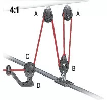 • Fine-tune mainsheets where the gross tune is 4:1 and a second line provides 16:1 trim control.