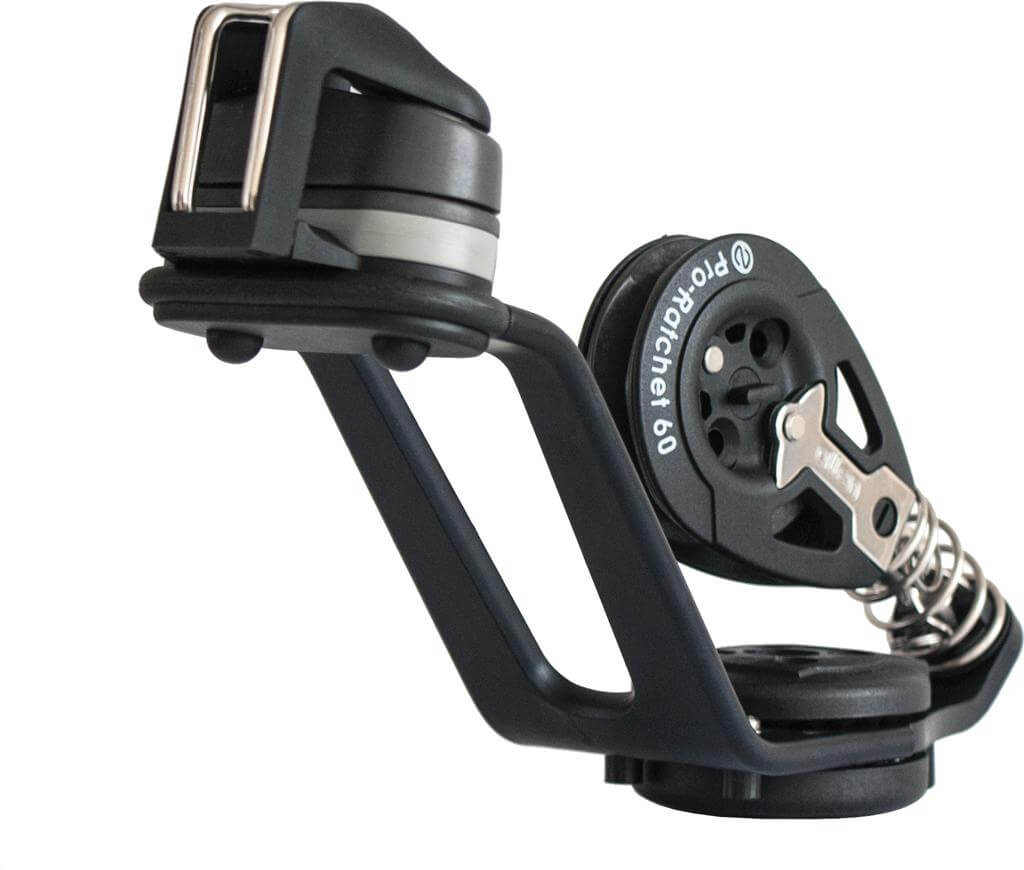 Standard mainsheet jammer systems usually have the block centrally located above the swivel meaning there is no turning force to swivel the block and jammer to the correct angle. By moving the block outward from the swivel and angling it away from the cleat, the A5266 mainsheet system creates turning force on the block and jammer meaning the cleat will always be forced to point away from the boom and towards the helm. This prevents the sheet from wrapping round the block and gives extra control for fast, smooth tacks and gybes. Standard height mainsheet jammer available with or without 60mm Pro-Ratchet Block. The arm can be set to rotate in 180, 220 or 360 degrees by adjusting the stopper pins on the underside of the arm. The arm swivel features two rows of ball bearings to ensure a super smooth rotation of the jammer arm. Includes A..76-496 aluminium cam cleat with mega pro-lead.